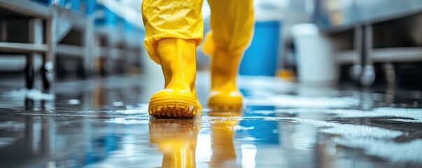 Plumber wearing yellow rubber boots inspecting a flooded kitchen after a water leak
