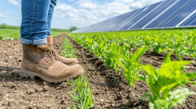 A person is standing in a field of plants, wearing boots and looking down at the ground. The field is filled with green plants, and the person appears to be inspecting them