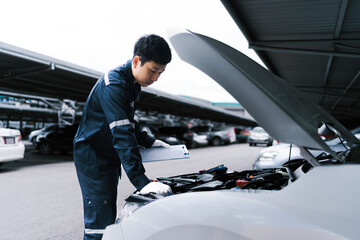 Mechanic check list to the clipboard insurance with inspecting car at garage workshop, Car auto services and maintenance check concept.