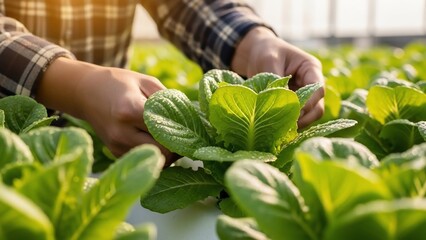 Farmer inspects fresh lettuce quality in a greenhouse during harvest season while ensuring the best produce for market