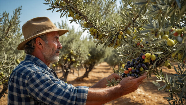 Experienced farmer in traditional hat carefully inspects his olive crop, looking forward to a bountiful harvest under the warm suns glow