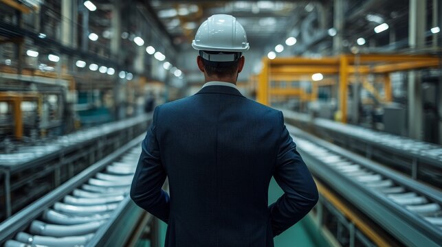 Back view of manager in suit and white hard hat inspecting large-scale manufacturing plant for quality control