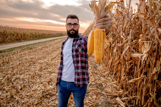 Male farmer inspecting hydroponic lettuce plants in a large greenhouse