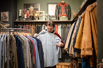 Attractive mustachioed man in knitted sweater shopping for shirts in fashionable men's clothing vintage shop, male holding hanger with item and inspecting quality of fabric and model of striped shirt.