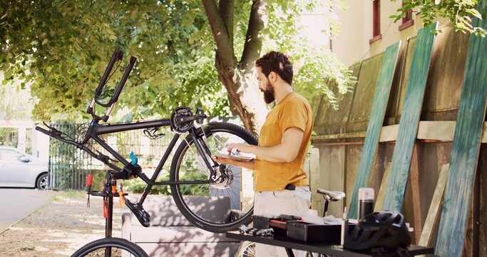 Male cyclist holding personal computer and inspects bike pedal and crank arm for damages in home yard. Active caucasian man enjoys browsing internet, fixing and maintaining modern bicycle.