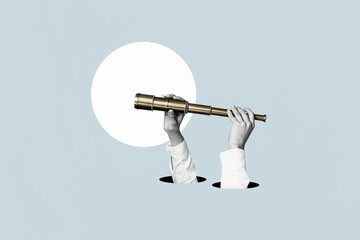 A woman with a laptop is sitting on a big magnifying glass. Art collage. Searching for information on the internet concept.