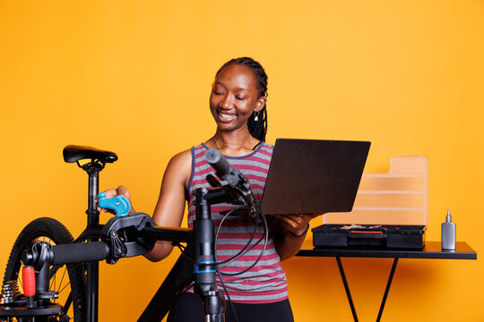 African American female inspecting and repairing bike with specialized tools and digital instructions from wireless computer. Active black woman examining and servicing broken bicycle with laptop.