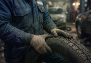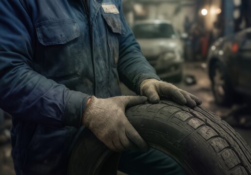 Mechanic inspecting car tire in auto repair shop, hands wearing gloves