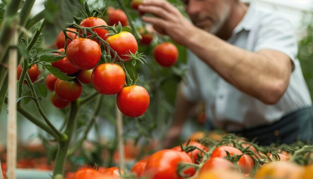 A farmer inspecting ripe tomatoes in a greenhouse, their vibrant red hues a testament to nature's abundance. Precision and care define every aspect of agricultural cultivation.
