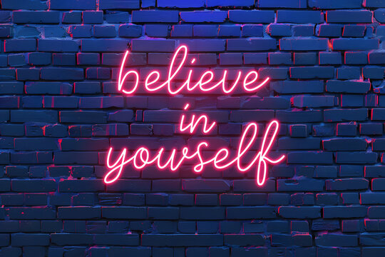 Neon sign with text believe in yourself on brick wall, motivational and inspirational quotes