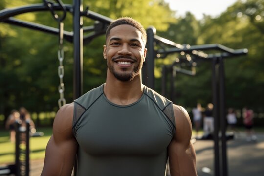 A man working out on outdoor fitness equipment, showcasing his commitment to a healthy lifestyle in the refreshing open-air surroundings, offering inspiration.