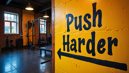 Motivational wall sign reading "Push Harder" in a vibrant gym setting with exercise equipment