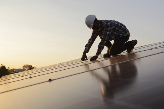 Worker installing solar panel on roof