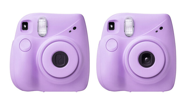 Closeup of purple instant photographic camera, isolated on white copy-space background.