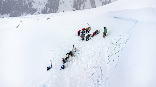 Skitourengänger auf einem Lawinenkegel suchen nach Verschütteten während einer Übung mit Bergführer