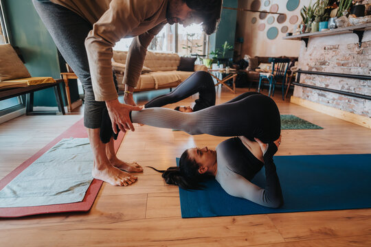 Female trainer assisting young woman with side stretching exercise in a modern yoga studio