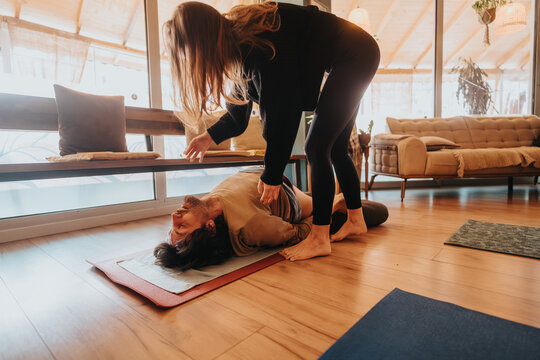Female yoga instructor guiding group through restorative stretch in bright studio