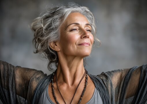 Elderly yoga instructor guides a class with gentle movements and a calming presence in a peaceful studio setting