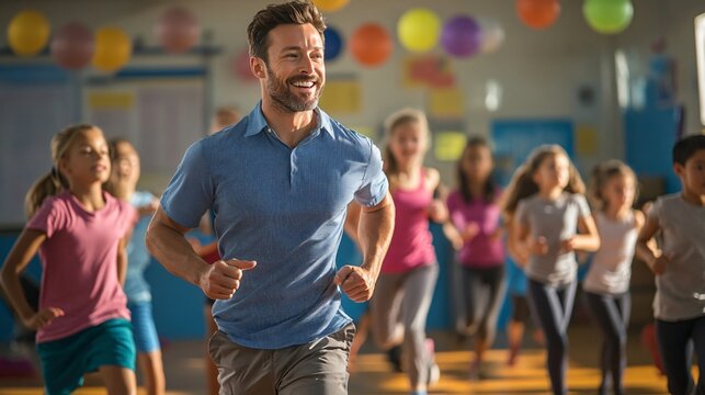 Joyful swimming lesson with enthusiastic instructor and kids