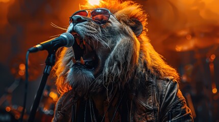 A lion with a mane wears sunglasses and a leather jacket, singing into a microphone under dramatic lighting at a rock concert, embodying strength and creativity.