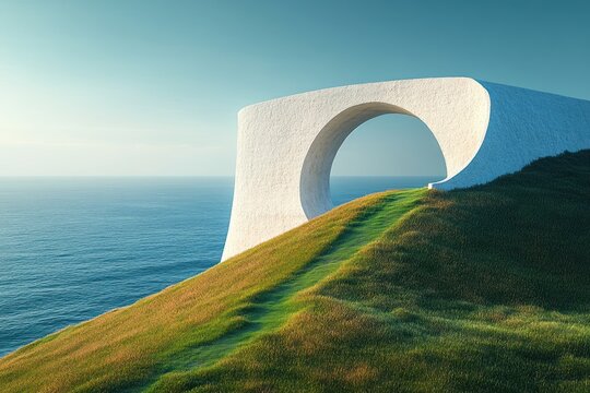 Archway in Minimalist Landscape with Soft Morning Light and Clear Blue Sky