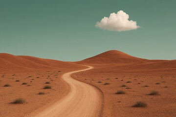 Minimal Desert Landscape with Winding Sandy Path, Single White Cloud, Red Dunes, and Teal Sky