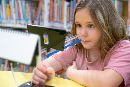 Little girl during a Convergence insufficiency treatment. Vision therapy concept.