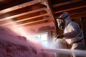 Construction worker thermally insulating eco-wood frame house with wood fiber plates and heat-isolating natural hemp material. Finishing the walls with a white wooden board, using laser line level.