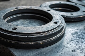 Technical rubber gaskets for large vehicles on a gray background featuring space for text Round oil and petrol resistant gaskets designed for specialized equipment and