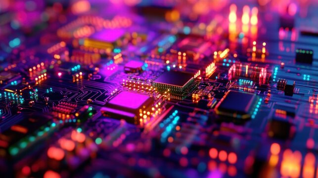 A closeup of an advanced CPU chip on the circuit board, glowing with blue and purple lights, symbolizing technology's impact in artificial intelligence