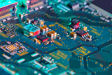 Microprocessor chip on blue circuit board for innovation and technology concepts