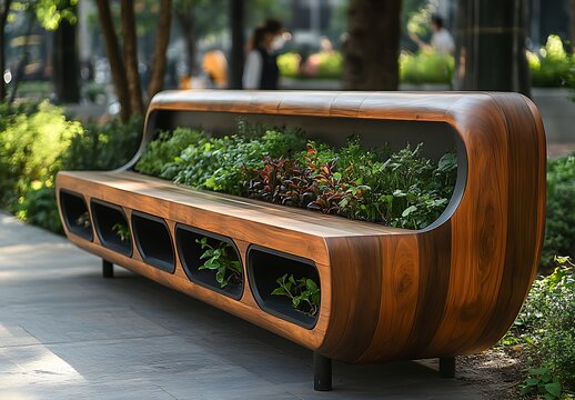 Modern Wooden Park Bench with Integrated Planters and Seating image photo