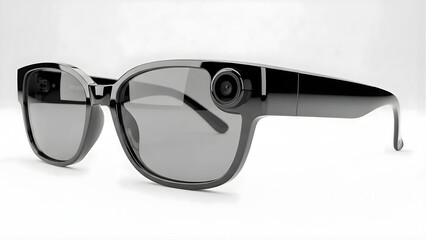 Modern black smart glasses with integrated camera lens, futuristic eyewear for augmented reality and recording, stylish wearable technology isolated on white background, 3D product rendering