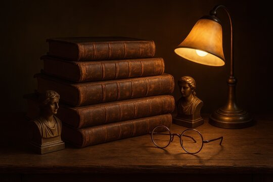 Vintage leather-bound books stacked on weathered oak desk creating scholarly atmosphere for education and knowledge-based content