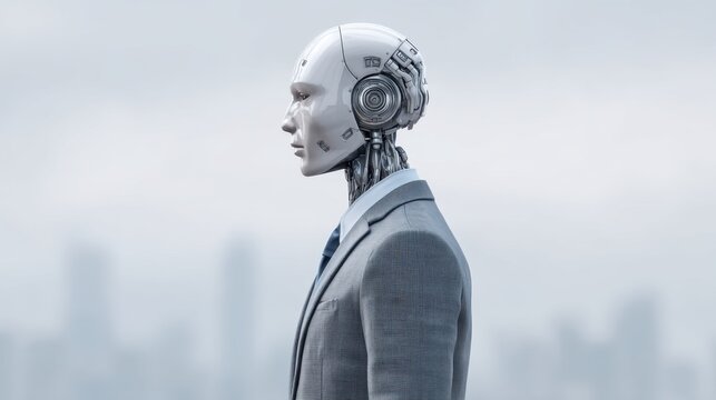 Futuristic humanoid robot in business attire standing against a blurred city skyline, showcasing technology and innovation in a professional context.
