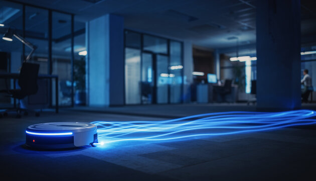 Robotic arm holding smartphone with floating symbols in futuristic office