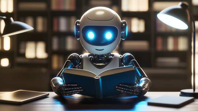 A close-up view of an intelligent robot holding a glowing crystal. The robot's hands gently cradle the transparent object, which is emitting a bright blue light