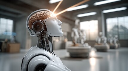 Futuristic humanoid robot with chrome panels and orange visor in lab