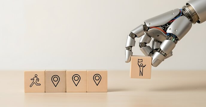Intelligent robot hand places success block, symbolizing strategic planning and achieving goals with precision and innovation.
