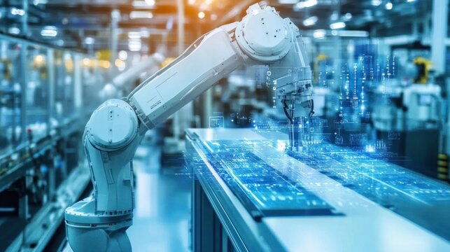 robotic arm catch for electronic assembly line. The robot for smart technology manufacturing process.