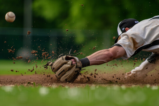 Intense action shot of baseball player sliding into base, focus on the ball and dust, blurred baseball player face, competitive sports, game day excitement.