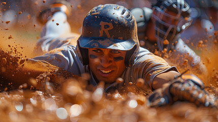 Baseball player diving to base during exciting game