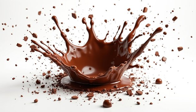 Melting chocolate splash, burst explosion on white background. Liquid cocoa, dark chocolate pieces, candy flying in air. Sweet dessert food concept, ingredient for drinks, baking cakes, sweets.