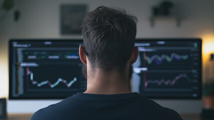 Analyzing the Market: A focused man sits before a large monitor displaying complex financial charts and graphs, showcasing dedication and concentration in the world of finance and investment.
