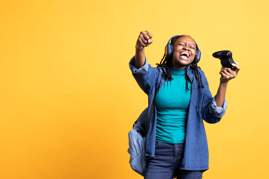 Euphoric african american teenager playing intense gaming console game, celebrating win, studio background. Ecstatic BIPOC young girl using controller, excited after being victorious in videogame