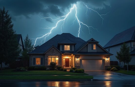Dramatic night scene lightning strikes over suburban house. Thunderstorm clouds cover the sky. Dark weather creates intense atmosphere. Lights glow in home windows, illuminating yard, wet street.