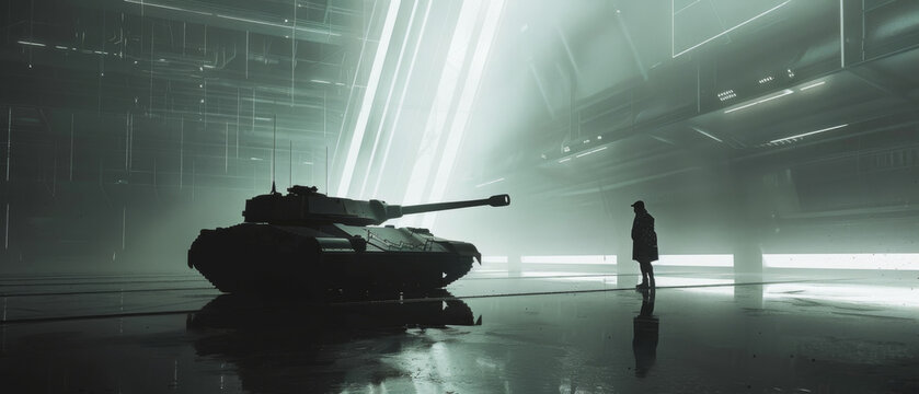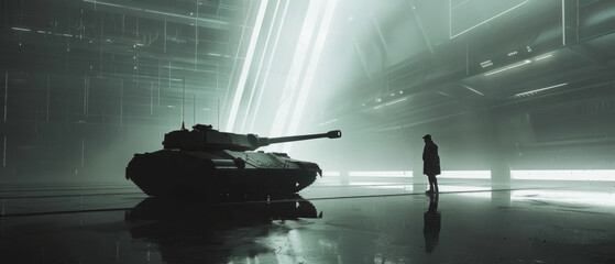 A solitary figure confronts a tank in an expansive, high-tech facility, illuminated by bright, futuristic lights, creating an intense standoff scene.