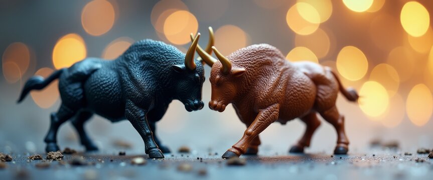 Two striking bull figurines, one black and one brown, engage in an intense face-off against a backdrop of shimmering bokeh lights. This captivating scene symbolizes strength and determination, evoking