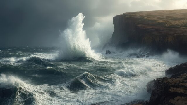 Dramatic ocean waves crashing against a rocky cliff during a storm