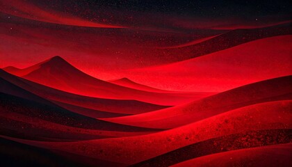 Stylized, surreal crimson landscape with undulating dunes and starlit sky